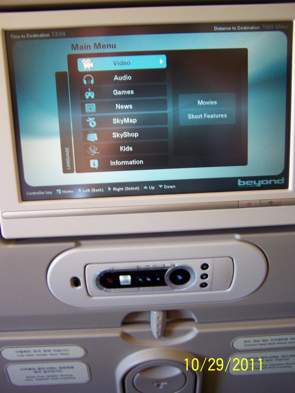 The flight from Chicago to Seoul, South Korea was 13 hours. The plane was large- 3 seats, 4 seats, and 3 seats. Kirby and I were behind Dwight and LeeAnn, and we each had a person on the end. However, our guy got up and moved, so Kirby and I got an extra seat to stretch out on- SWEET! We flew Korean Air, which was super-nice. Each seat had a personal monitor with headphones, and we could watch movies or tv shows, listen to music, or play video games.