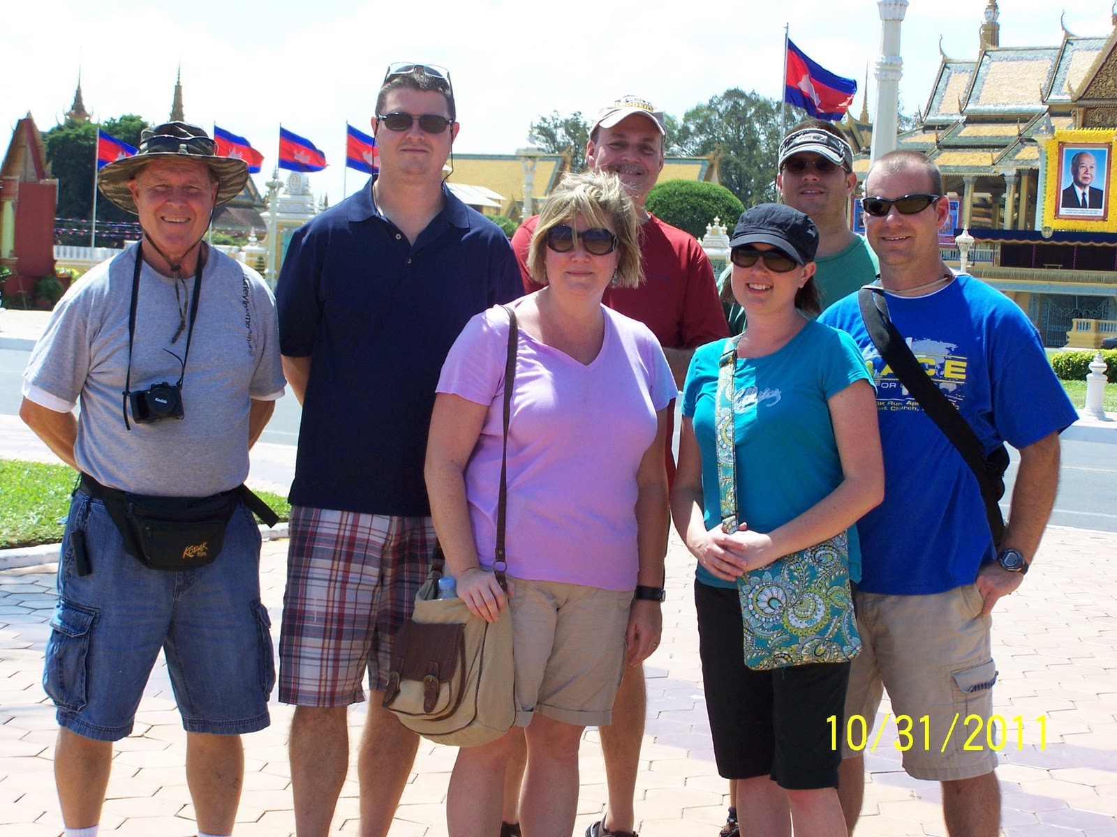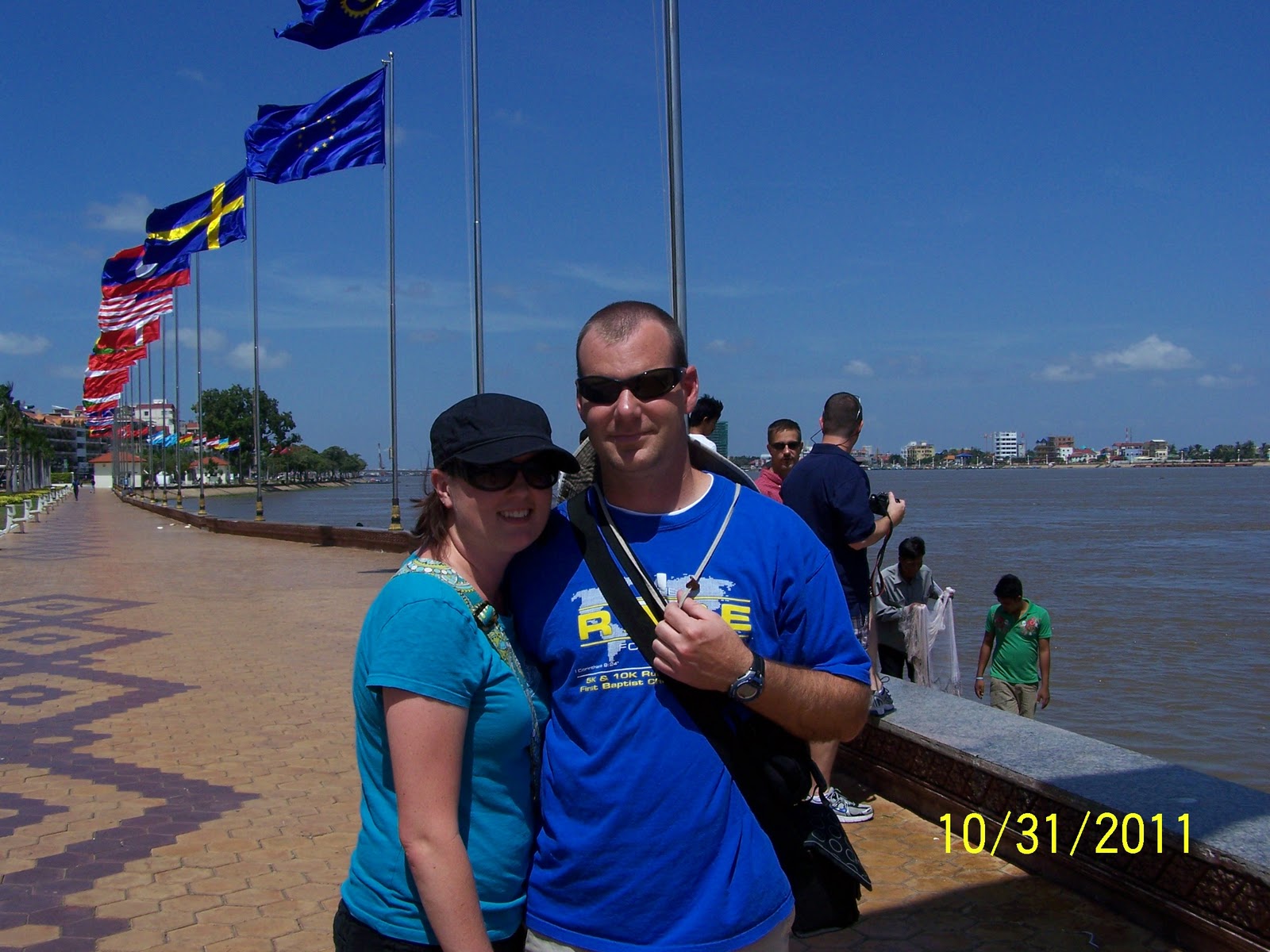 After such a depressing adventure, we moved on to a happier place- the waterfront in front of the king’s palace. It almost felt like I was at Epcot center in Disney! The waterfront was lined with flags flying for every nation imaginable (even an American flag!), and there were banners and signs everywhere. Today is the king’s birthday, which is a holiday here. It was quite festive and the city was bustling with excitement. We walked around and took pictures, looking like the true tourists that we are. The Cambodians had a good time laughing at us, but the teasing was good-natured and they were all really friendly. We had lunch at a great restaurant, and the food was delicious! (Cashew chicken for me- yum!)