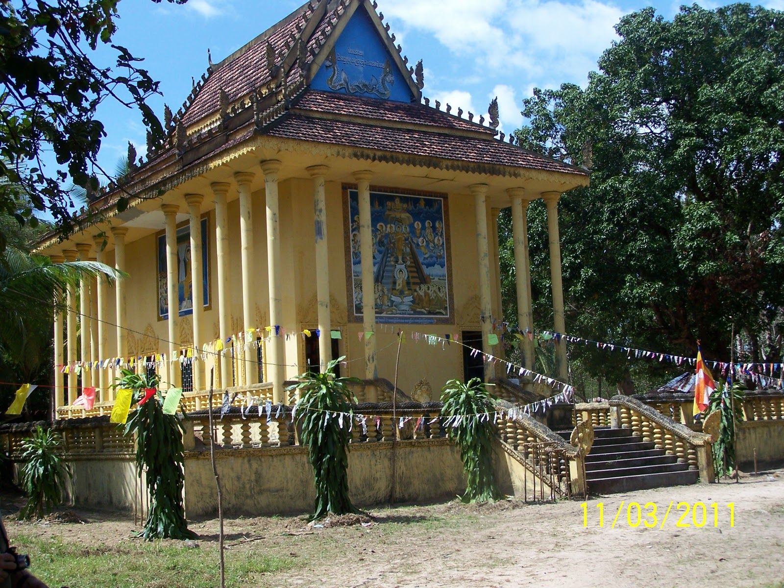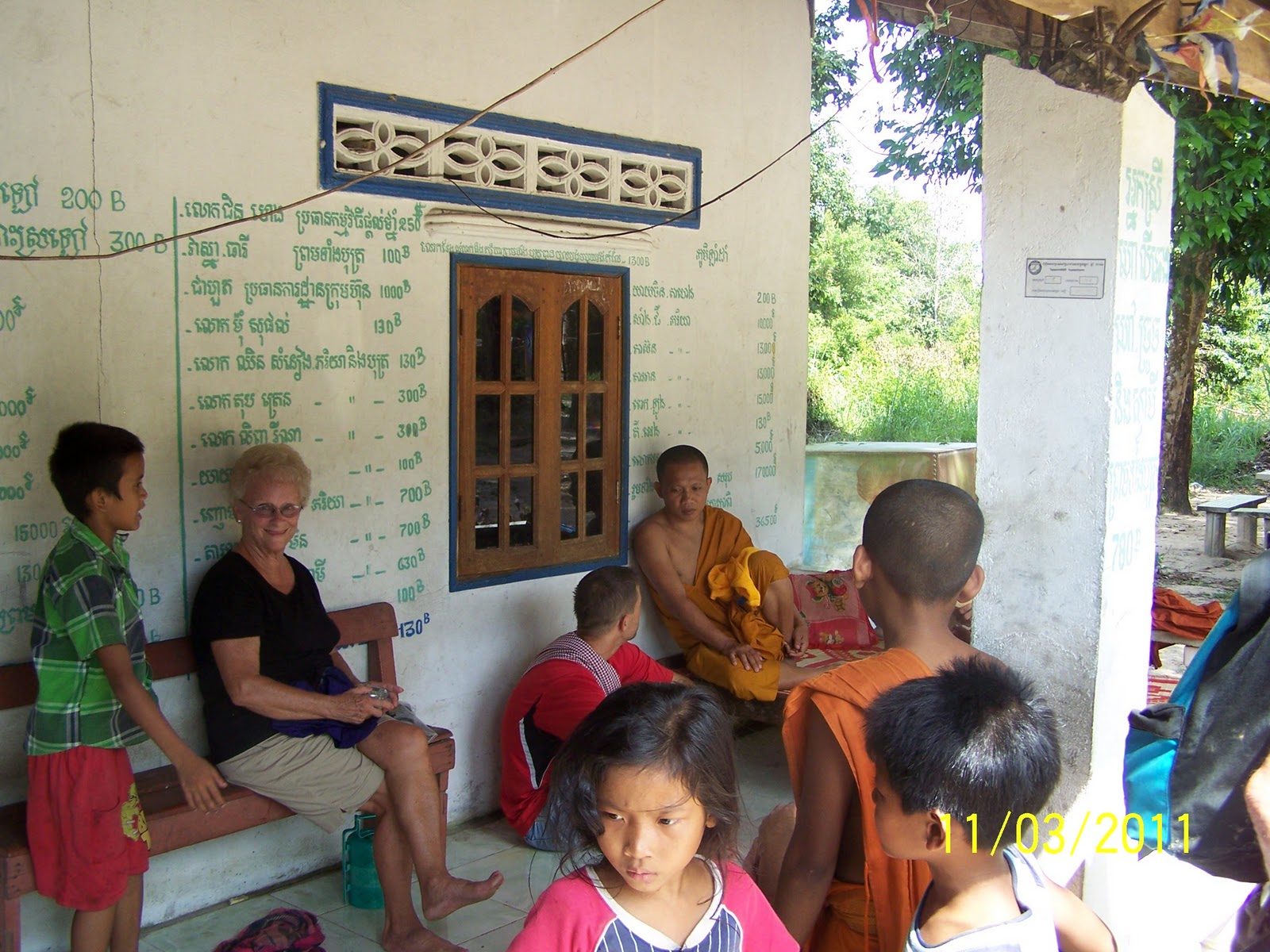Today is a special religious day, so the children were out of school. On this day, they prepare food and offerings and take them to the wat. Although the children were out of school, they were very eager for us to see their school, and they led us uphill through the jungle. Their principal met us and unlocked the school so we could see a classroom. They had a long wooden table in the middle with benches, and there were whiteboards all over the walls, completely covered in Khmer writing. They also had stacks of books all over the room. It was very hot, mosquitoes everywhere, and there was no power.