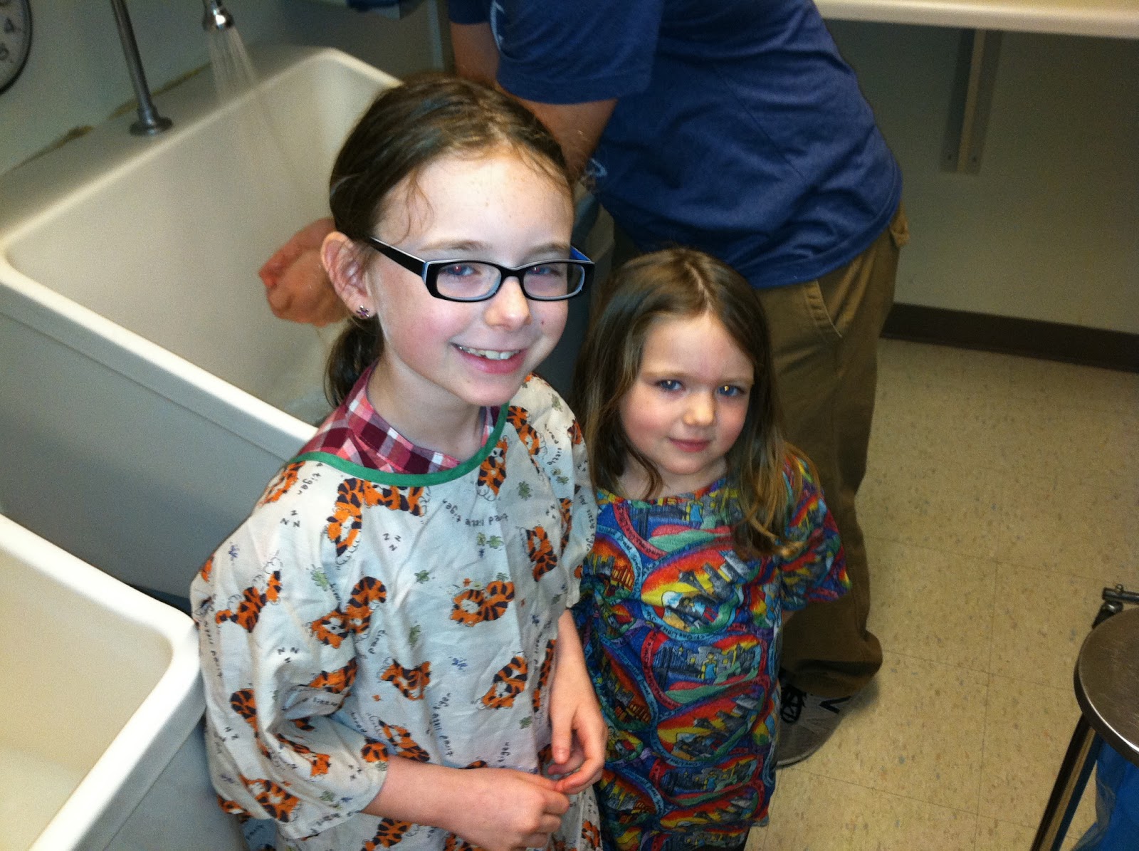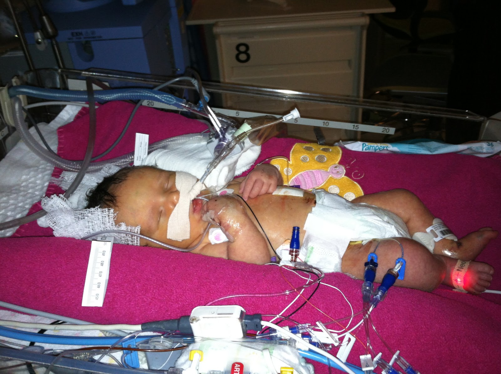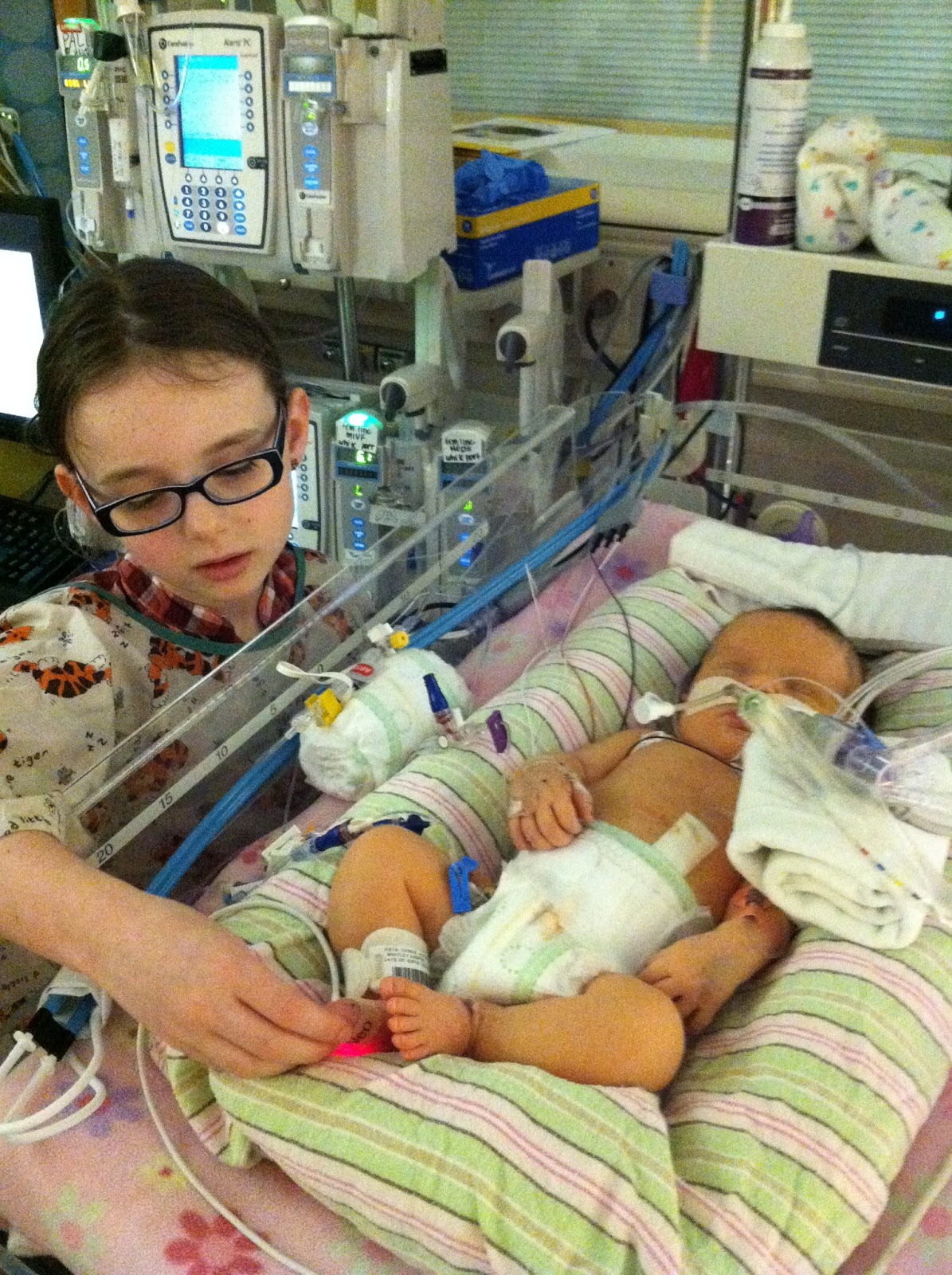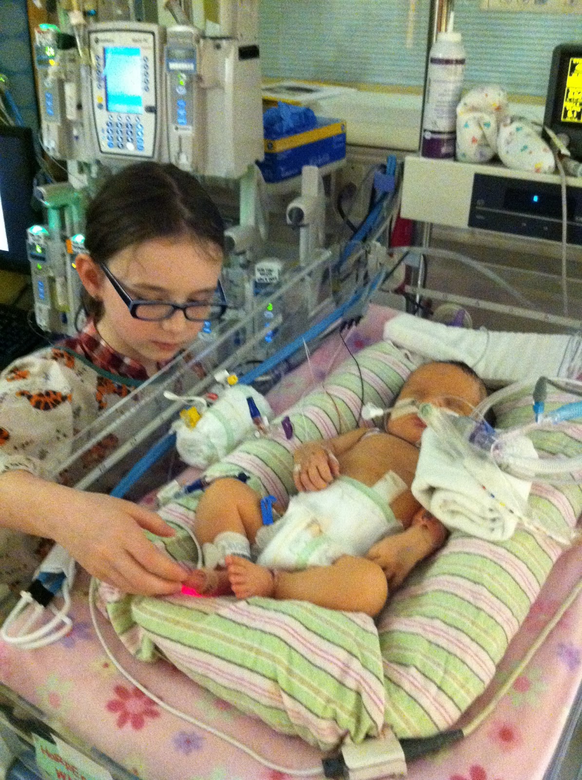 Harper has been fairly stable the past day and a half. They removed all the EEG equipment today and haven’t seen any more signs of seizure activity. She still has her breathing tube, but has almost been weaned from it. Today is her last day of being hooked up to the machine that holds her body temperature at 92-93 degrees. Her head circumference is maintaining its size, so that’s great news in terms of swelling. Her blood pressure is the least stable of everything at this point, so she’s being medicated and monitored closely for that. Right now she has her second neurosurgery tentatively scheduled for Thursday to try again. Oh, and on a happy note, both big sisters were able to come in and see her today!